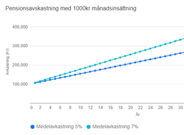 Om du sparar långsiktigt och får 7 % avkastning istället för 5 % per år – så kommer du efter 40 år att ha ungefär 30 % mer i kapital, trots att du sparat exakt samma belopp.